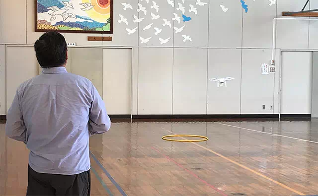 体育館で室内実技講習です。ドローンはプロペラを回して揚力を得るため、独特な感覚と操縦方法を身に着けます。