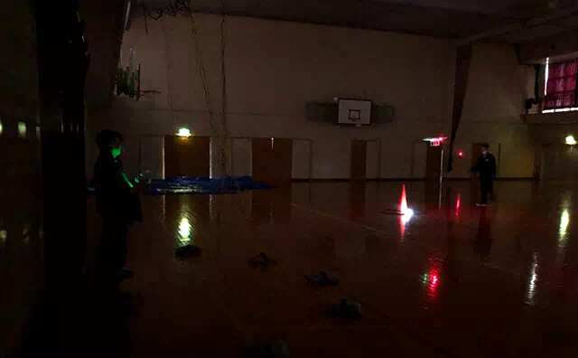 夜間飛行講習は体育館の照明を消して夜を模した環境で行います。