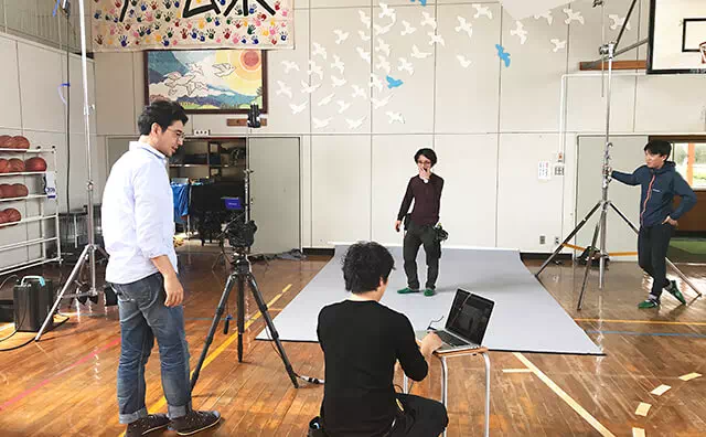 体育館では天井の高さを活かし、真上から照明を当てて撮影を進めます。