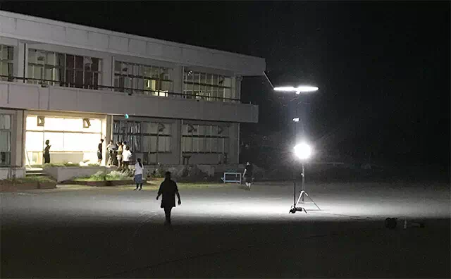 屋上には音楽室にある楽器を運び小道具として使いました。校庭側からライトを当て撮影する場面も。