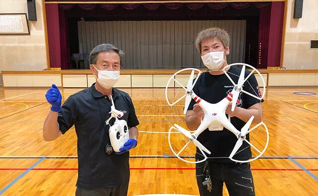 2日目から行った体育館でのフライト訓練は、屋外と違い思っていたよりも操作が難しいとおっしゃっていましたが、何度も練習してドローンを安定させて移動出来るようになるまで上達しました。