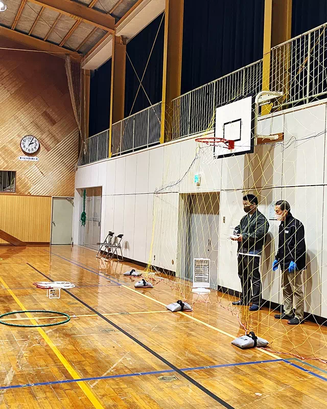 体育館でのフライト訓練ではドローンを真っすぐ進めることに苦戦しておりました。