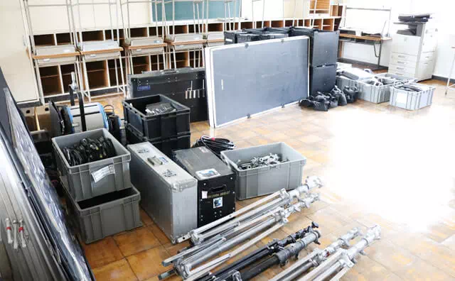 様々な機械や機材を持ち込み準備開始。3Fにある学年教室と音楽室を撮影場所とし、多くの物を運ぶのに校舎についているリフトを活用し運搬。