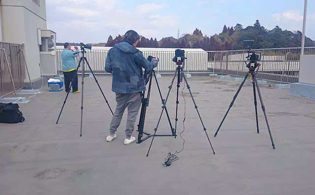 屋上では三脚を使いカメラをセッティング。天気にも恵まれ、気持ちの良い青空の下、撮影は進みます。