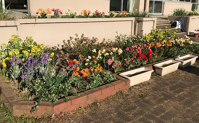 造花を使い色とりどりの花が咲き誇る花壇も再現。