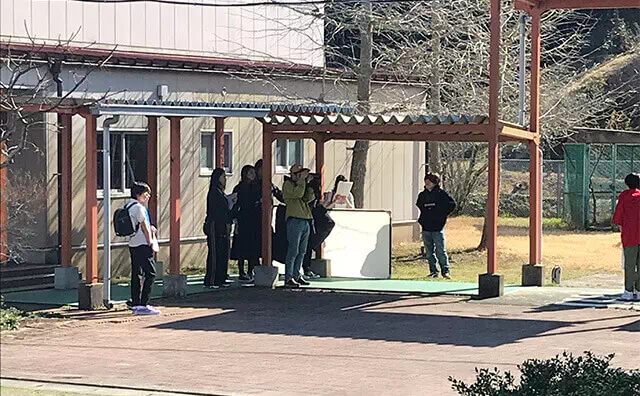 教室での撮影では、背景に黒板を使用し、リアルな学校の雰囲気を演出しました。