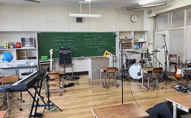教室で歌のシーンがあるため、バンドセットを教室に入れこんで撮影されていました。