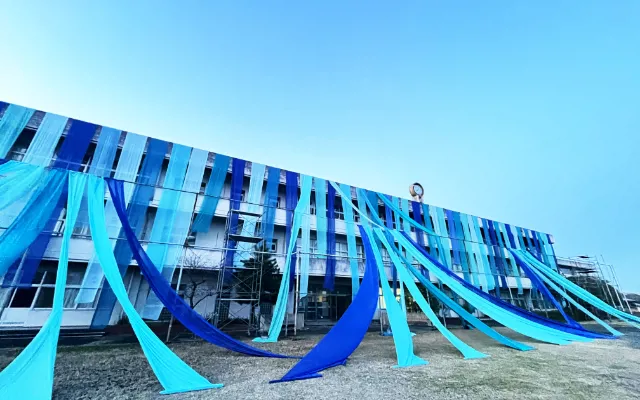 校舎一面に空色の布を垂れ下げ、ネットにも空色の布で装飾を施されました。
